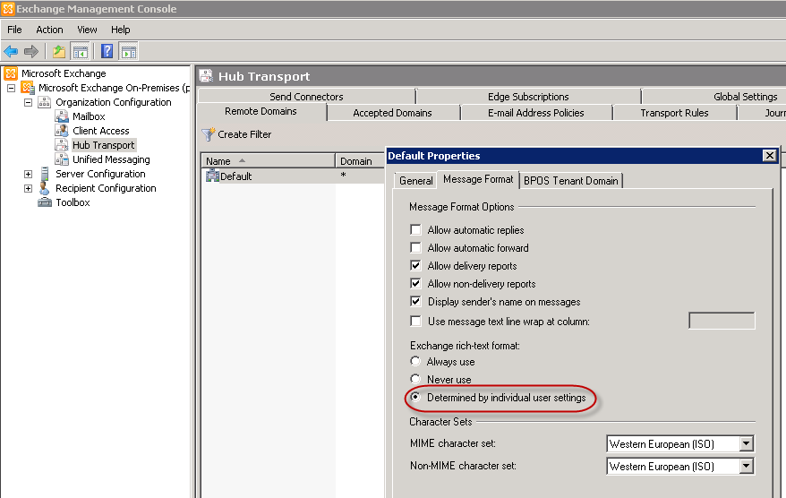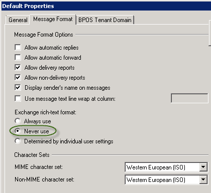 Exchange rich-text format” başlığı altındaki ayarı “Never use” olarak işaretleyin