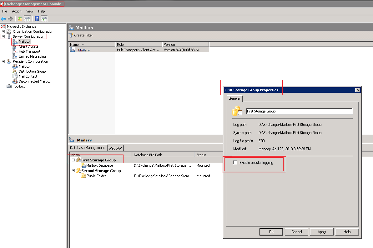 Exchange Management Console üzerinden Circular Logging’i kapatma ve ya açma