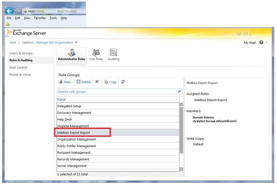 Öncelikle bu işlemi yapmak için Exchange Server 2010 üzerinde “Mailbox Export Import” yetkisine sahip olmanız gerekmektedir.